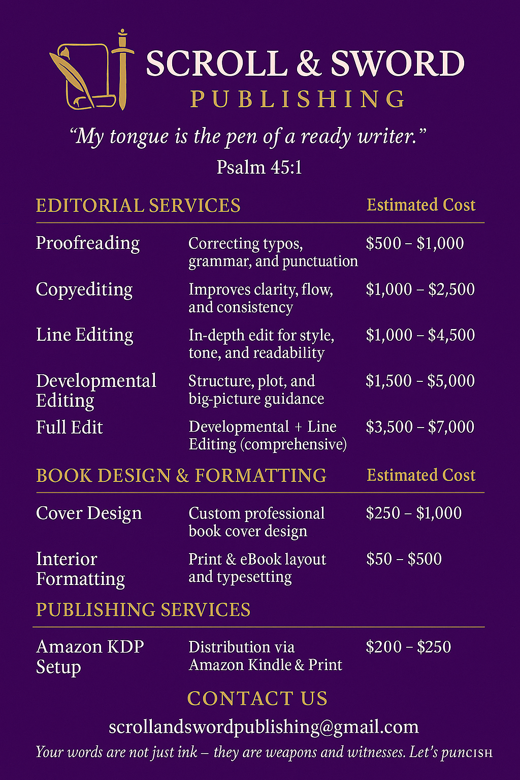 At Scroll & Sword Publishing LLC, we specialize in promoting and publishing Kingdom-based authors and their works. Our website serves as a platform for these talented writers to showcase their books and connect with readers from all around the world. As a publishing company, we strive to make our services accessible and affordable for all aspiring authors. Our pricing structure is designed to cater to the specific needs and budget of each individual writer.